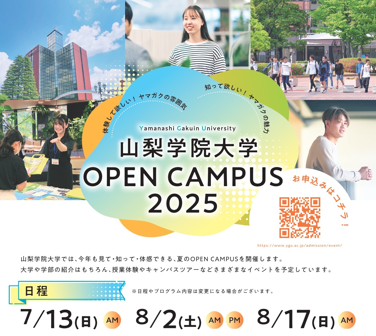今年度の夏も本学・酒折キャンパスにてオープンキャンパスを開催します。