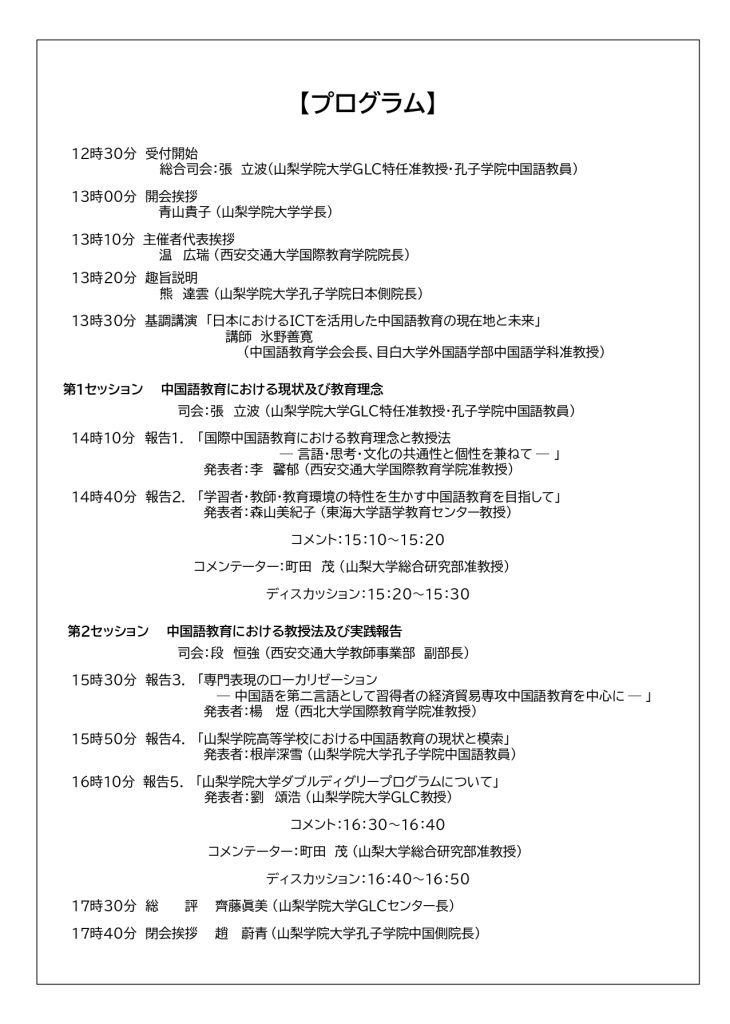 この度、山梨学院大学孔子学院および本孔子学院のパートナー校である西安交通大学国際教育学院の主催による中国語教育国際シンポジウム「日本における中国語教育の現状と展望」を開催する運びとなりました。