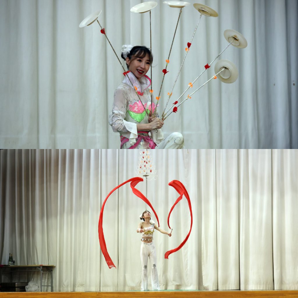 公演では、達人のお一人、于静さんは、バランス感覚を活かした「皿回し」、「中国独楽(こま)」、「ヘッドバランス」の秘技を披露。