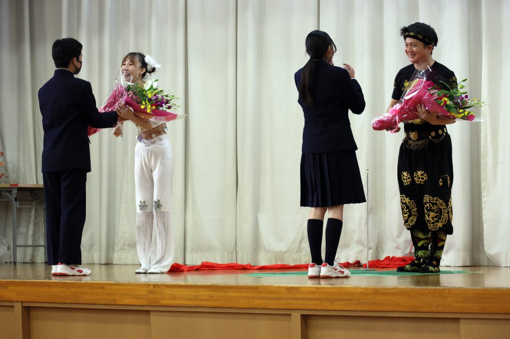 山梨学院大学孔子学院は10月23日、毎年恒例となっている「中国文化イベント」を山梨学院高校にて開催しました。本孔子学院は、2019年の開設の翌年から山梨学院高校の進学コースの生徒を対象に週2回の「中国語」授業を実施し、中国文化への理解促進に努めており、これまで年一回、進学コースの生徒を対象に中国文化イベントを実施してきました。過去には「楊琴」、「変面/京劇」、「中国武術/気功」の公演が行われました。同校の体育館で実施された4年目公演は、進学コースの1・2年生約550名の生徒を対象に、現在、日本国内での公演やテレビやCM等で幅広く活躍する2名の中国雑技の達人、于静さん、常玉星さんをお招きし、「中国雑技」の数々の秘技を披露していただきました。