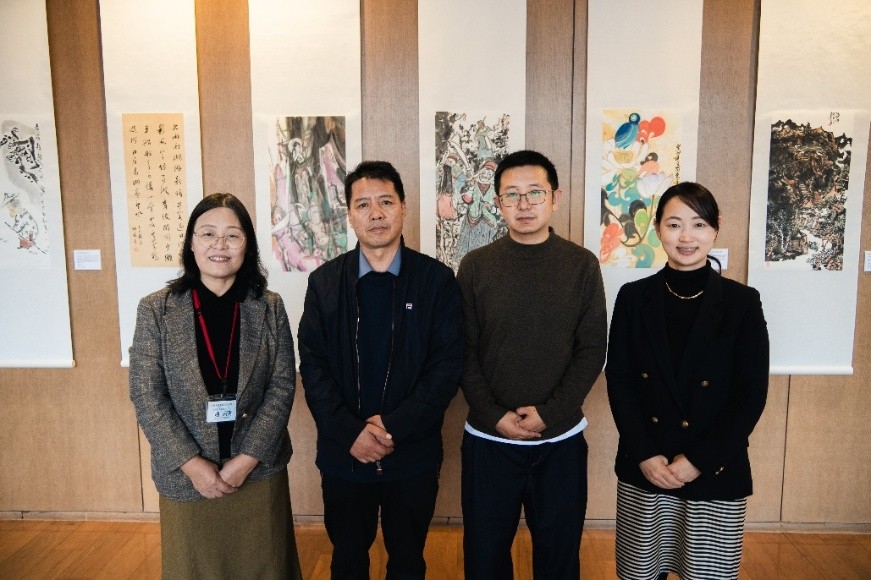 2025年度の「孔子学院の日」記念イベントは、古くから中国と西域を結ぶ重要な交通路である「シルクロード」が通ることで知られている中国甘粛省にある「甘粛画院(*注)」との共催により「“敦煌霓裳(とんこうげいしょう)” 甘粛画院美術作品展」と題し、「甘粛画院」の郭殿声(かく・でんせい)院長と国家二級美術師の司文洲(し・ぶんしゅう)氏をお招きし、「甘粛画院」に所属する20名の画家・書家による選りすぐりの作品が披露されました。