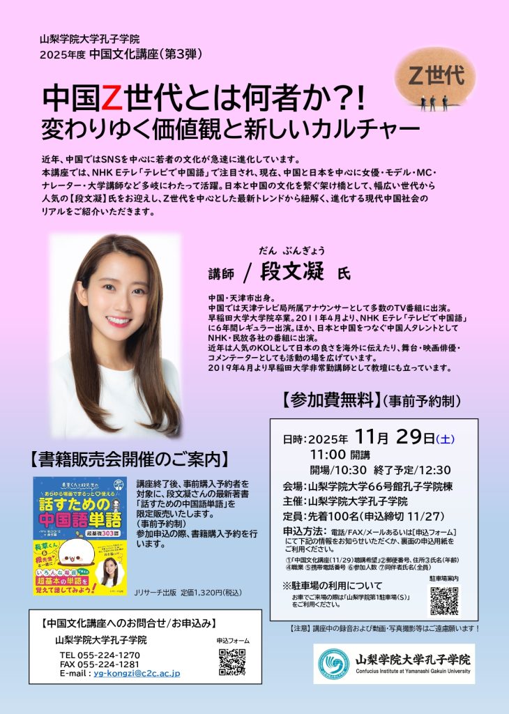 今回の文化講座では、「Z世代」をキーワードに、急速に変化する中国社会と中国の若者文化の最前線!SNSを通じて拡大する新しい価値観、日中の若者文化の違い、そして時代を映す中国の“今”を、多方面で活躍する段先生ならではの視点でご紹介いただきます。