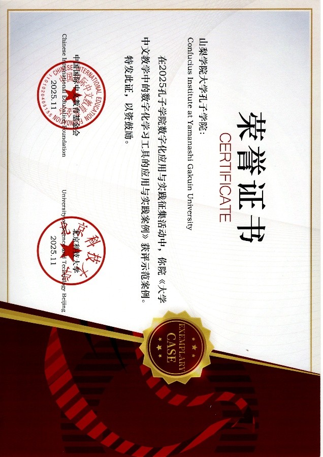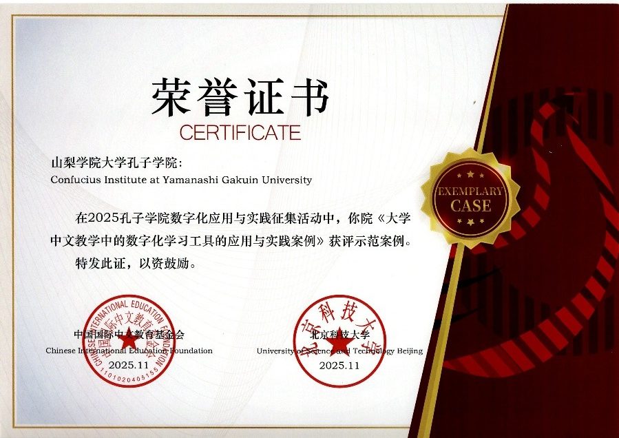 山梨学院大学孔子学院は、2025年11月14日~16日に北京で開催された「2025世界中国語大会」において、国際中文教育基金会主催の『孔子学院デジタルインテリジェンス応用・実践事例』評選で模範事例賞を受賞しました。
