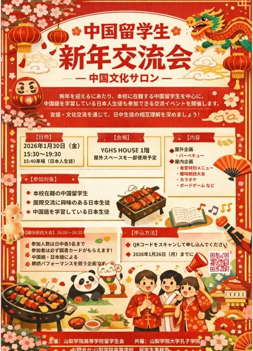 2026年1月30日(金)15:30~19:30、山梨学院高等学校留学生宿舎「YGHS HOUSE」にて、「新年会&中国文化サロン」を開催いたしました。