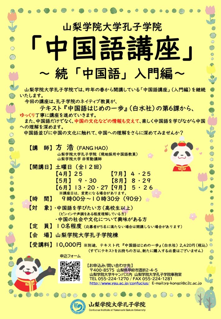 お申し込みは、下記のURLあるいは「中国語講座」~続「中国語」入門編~のチラシのQRコードまたは山梨学院大学孔子学院事務局(055-224-1270)までお問い合わせください。
