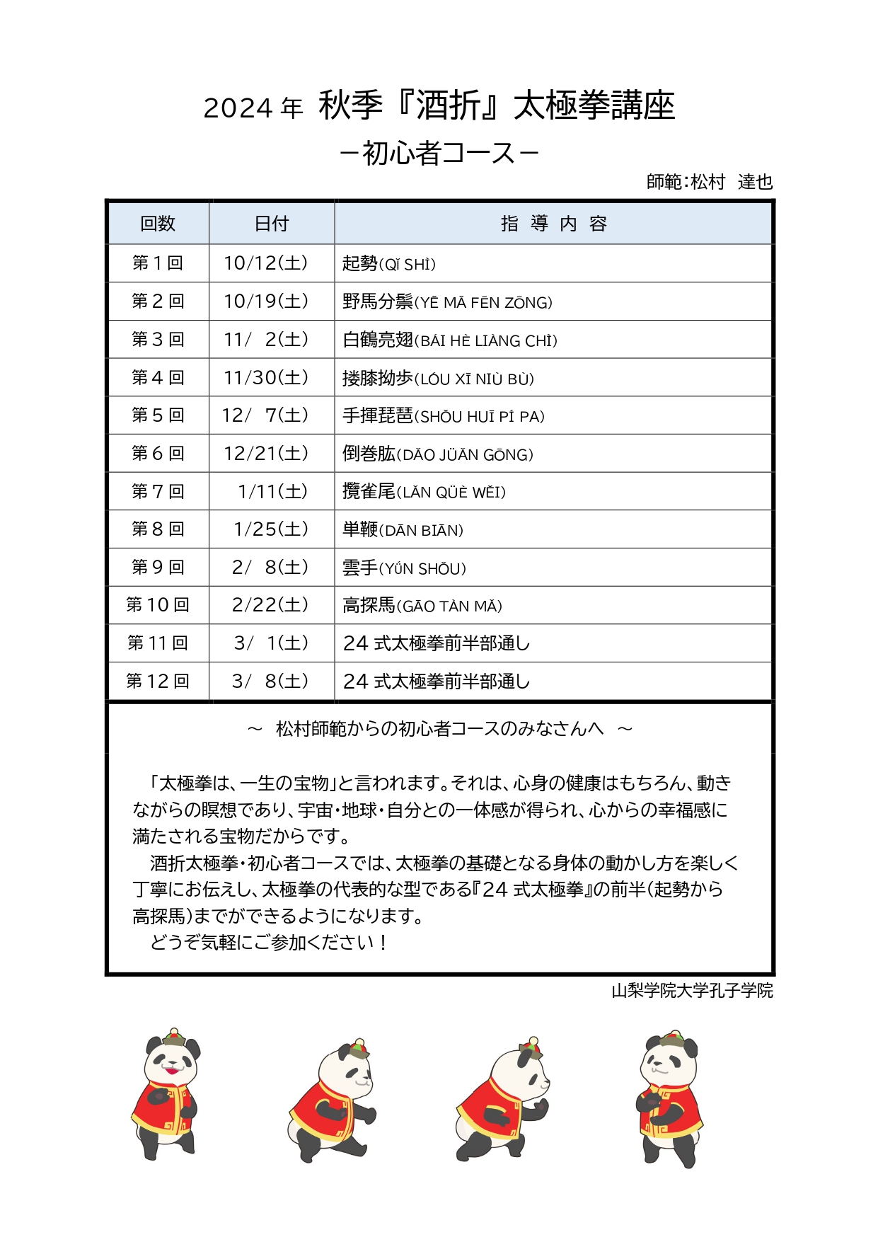 山梨学院大学孔子学院では、10月から開講する「太極拳講座」の受講者を募集いたします。