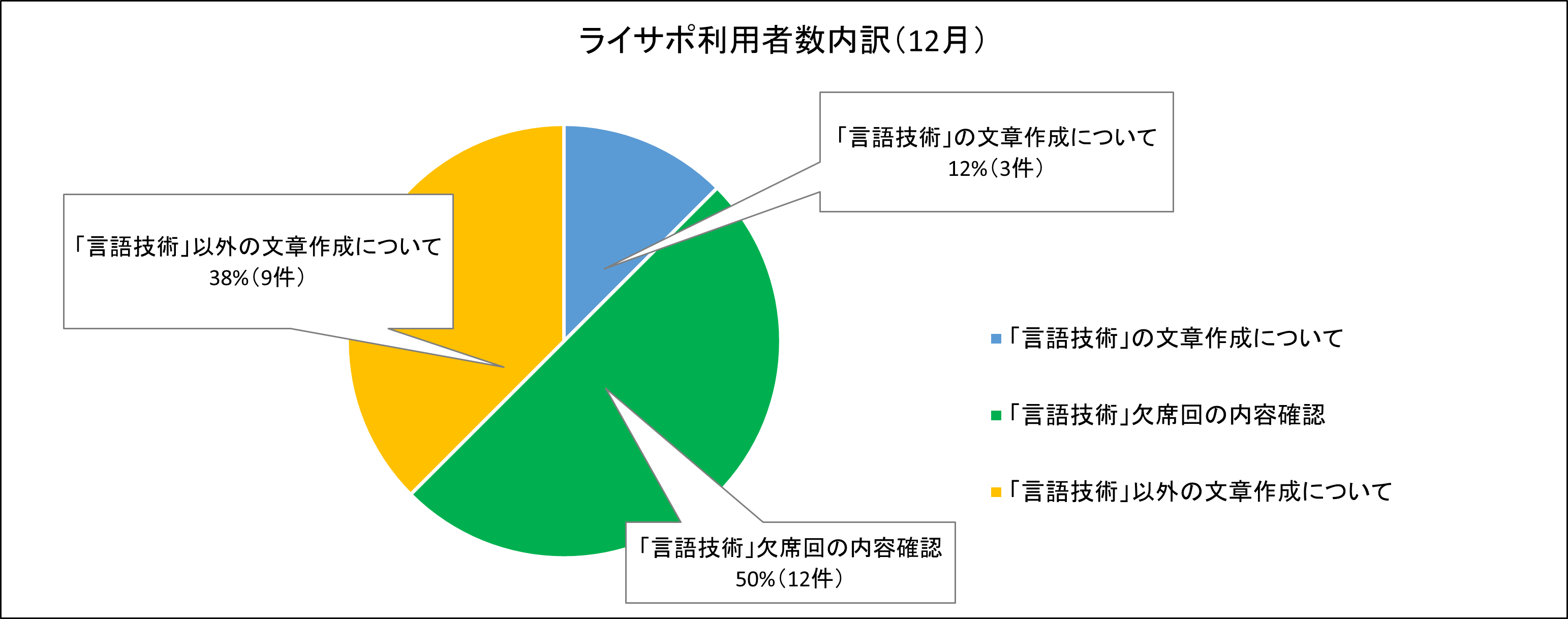 利用内容としては「言語技術」欠席回の内容確認が最も多く12件、「言語技術」授業のレポートの相談が3件、「言語技術」以外の授業のレポートの相談が9件(2年生:4件、1年生:3件、3年生:1件、4年生:1件)ありました。