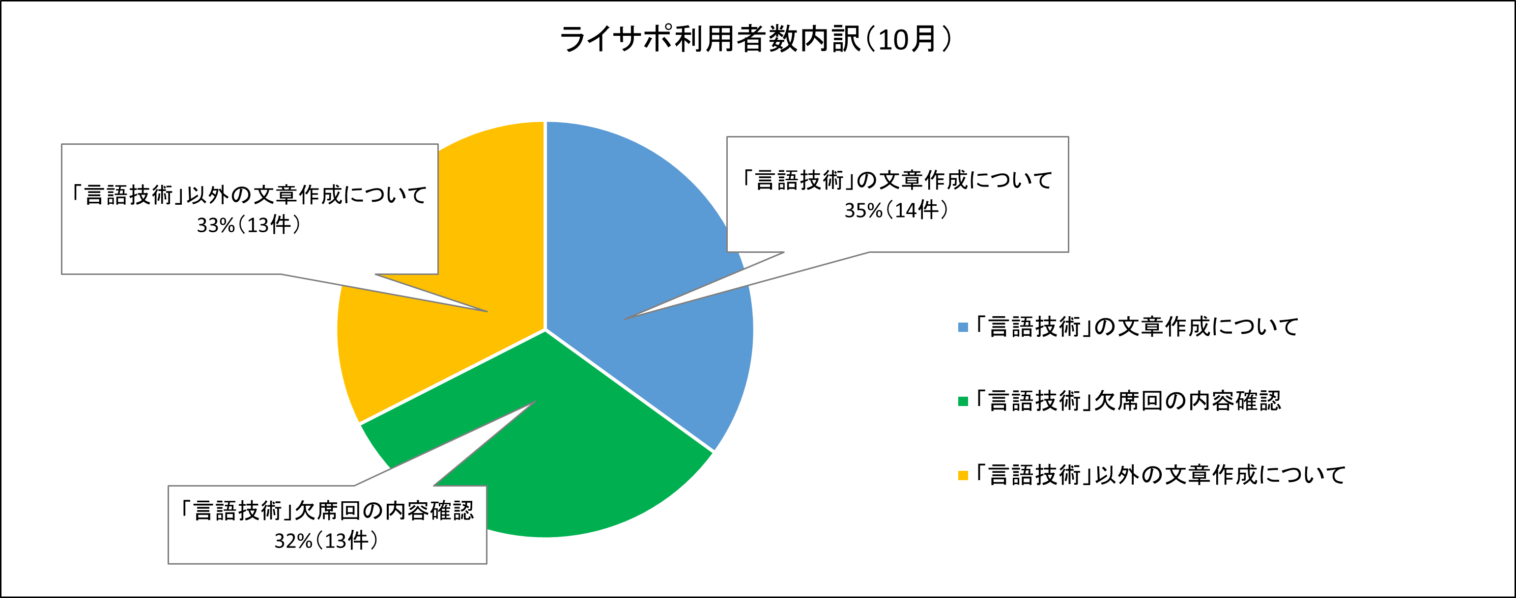 利用内容としては「言語技術」欠席回の内容確認が最も多く、33件の利用がありました。また、「言語技術」でレポート作成の準備が本格的に始まったこともあり、レポートのテーマや問いの相談に積極的に来室する学生も増えてきました。