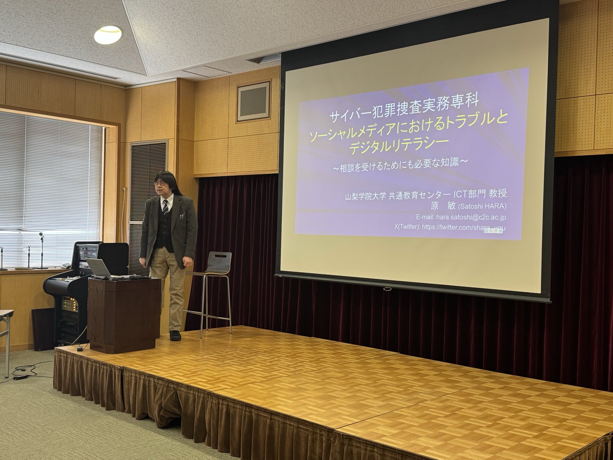 令和7年(2025年)11月11日(火)、山梨県警察学校(甲斐市)において、警察官研修「サイバー犯罪捜査実務専科」が実施され、山梨県警察本部サイバー犯罪対策課の依頼により、共通教育センター原敏教授が講義を行いました。