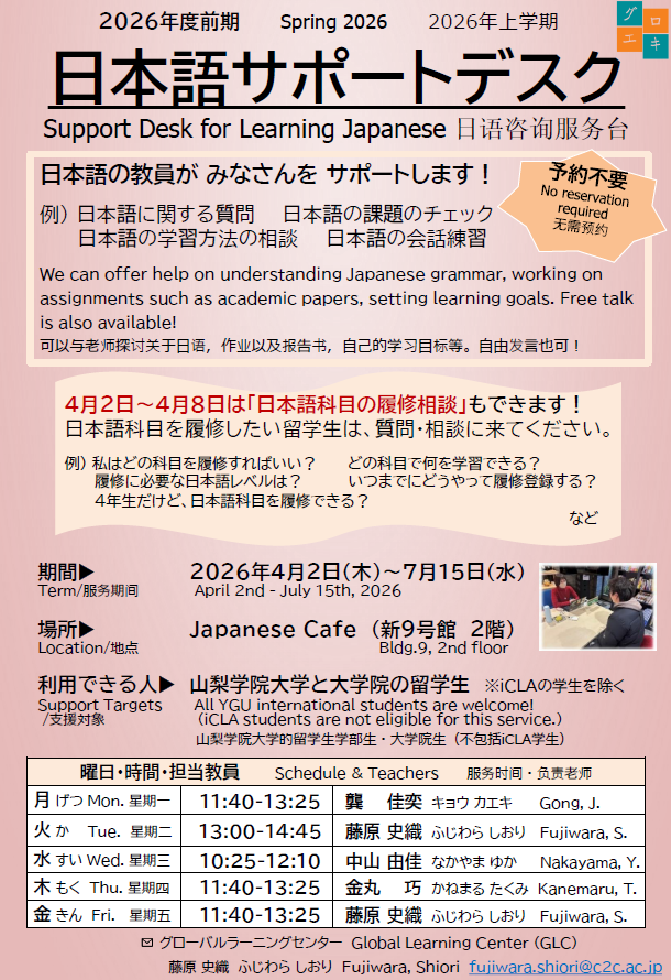 2026年度前期「日本語教員による専門的サポート」開室期間・場所