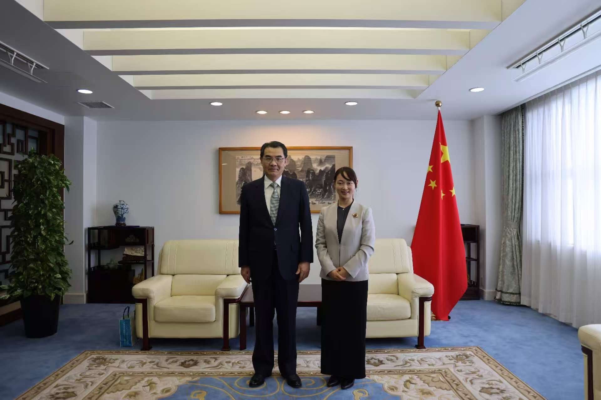 表敬訪問の席には、中国大使館から杜柯偉 教育処公使参事官、劉丹 一等秘書官、鞠娜娜 三等書記官、山梨学院大学から張華 副学長(国際化担当)、熊達雲 国際共同研究センタ-長が同席しました。