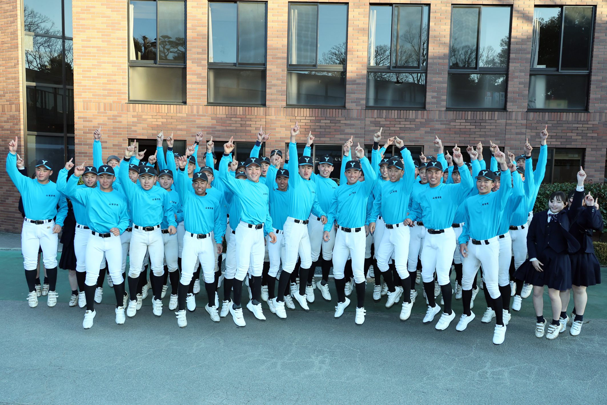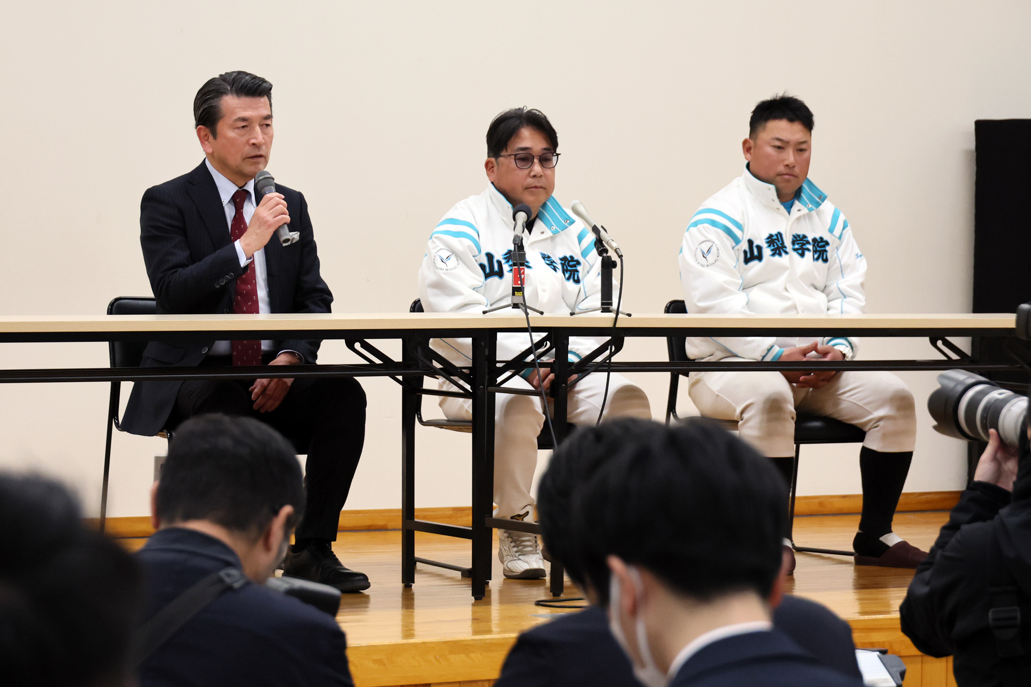 「第98回選抜高校野球大会」の出場校選考委員会が1月30日に行われ、山梨学院高校野球部が5年連続9度目の出場を決めました。選考委員会のライブ配信を学校のルネサンスホールで見守っていた選手たち、また同校の吉田正校長、吉田健人野球部部長、吉田洸二野球部監督らは出場決定の実況に喜びをかみしめました。組み合わせ抽選会は3月6日に行われ、大会は3月19日に開幕予定。高校球児の球春が到来します。