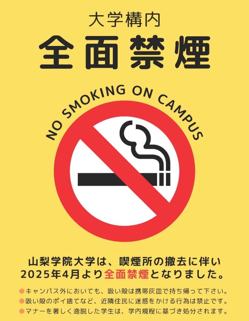2025年4月から、山梨学院大学では大学構内は全面禁煙となりました。これは、すべての学生がより健康で快適に過ごせる環境をつくるための取り組みです。周囲に迷惑をかけるような行動があった場合は、大学のルールに基づいて注意や処分の対象になることもあります。