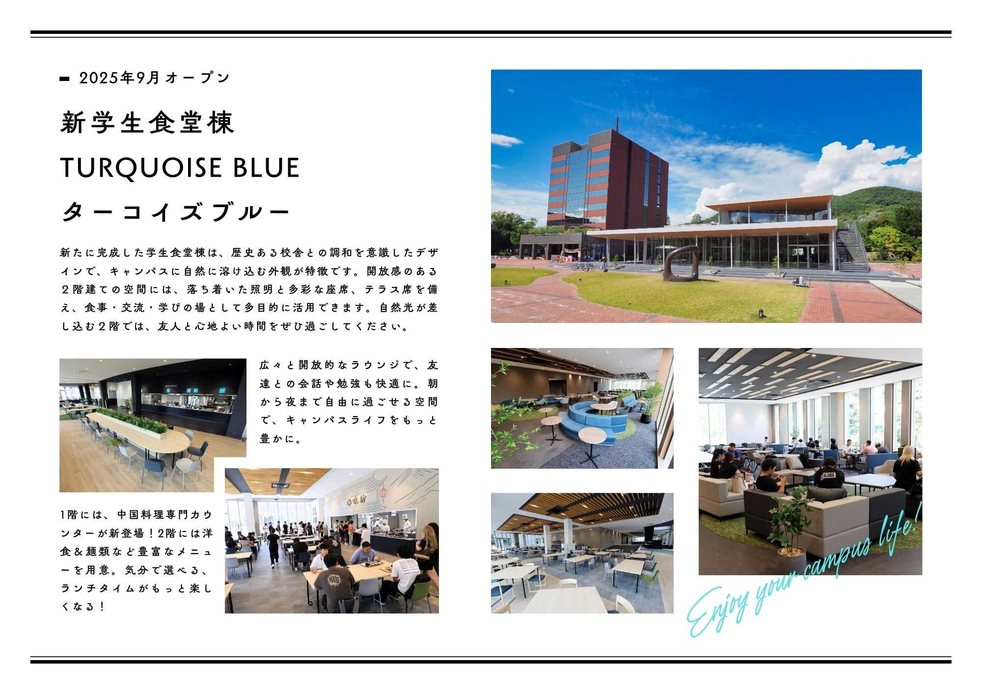 2025年9月8日、山梨学院大学に新しい学生食堂棟「TURQUOISE BLUE(ターコイズブルー)」がオープンしました。