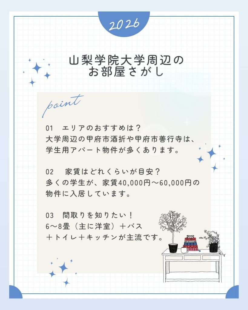 山梨学院大学の周辺には、学生向けのアパートが多数あり、安心して新生活を始められる環境が整っています。住まいに関する情報は、添付の資料にまとめていますので、新生活の準備にぜひご活用ください。 参考:お部屋さがしについて・不動産仲介業者リスト こちらから>> |