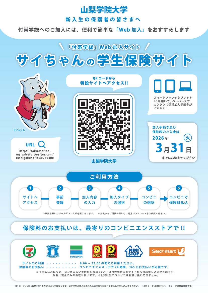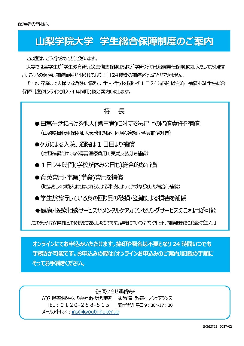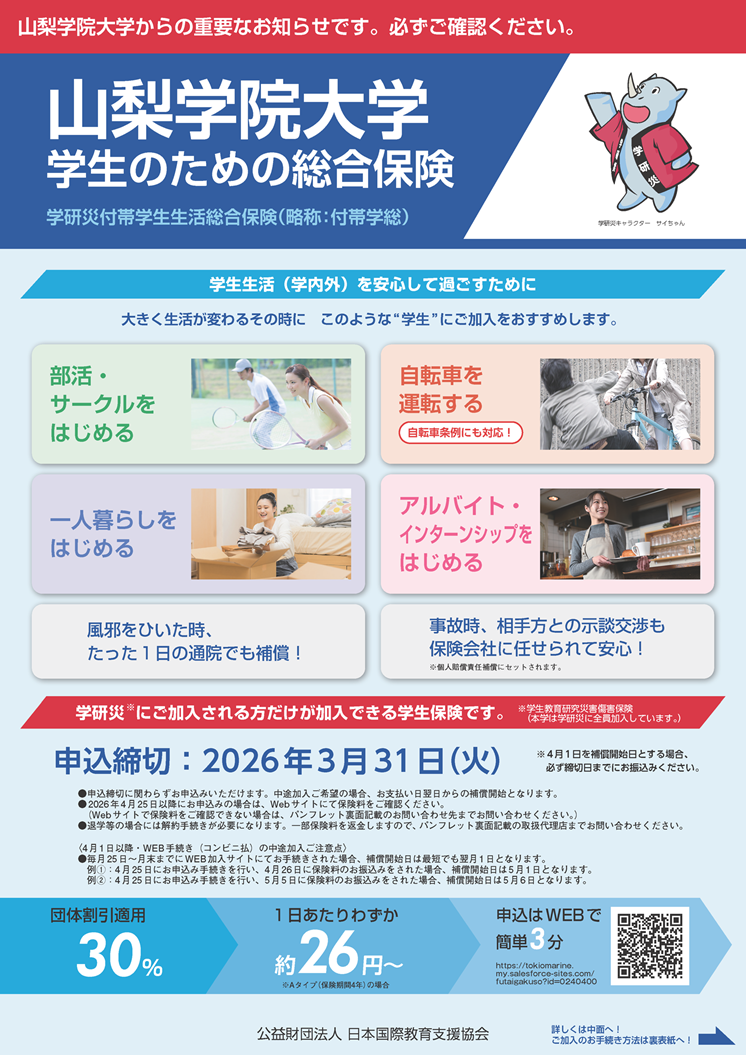 本学では学生の皆様が学生生活を安心して送れるよう、入学の際に(公財)日本国際教育支援協会の「学生教育研究災害傷害保険(略称「学研災」)」と「学研災付帯賠償責任保険(略称「学研賠」)」へ、全員が加入いたします。加えて、強化育成クラブ員及び一部の体育会系クラブ員は「スポーツ安全保険」にも加入します。これらの保険料は本学が負担し、加入手続きも大学で一括して行います。