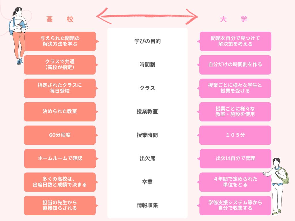 高校と大学では学び方が大きく異なるため、受け身の姿勢のまま大学生活を過ごしてしまうと、単位が取れず卒業できなかったり、