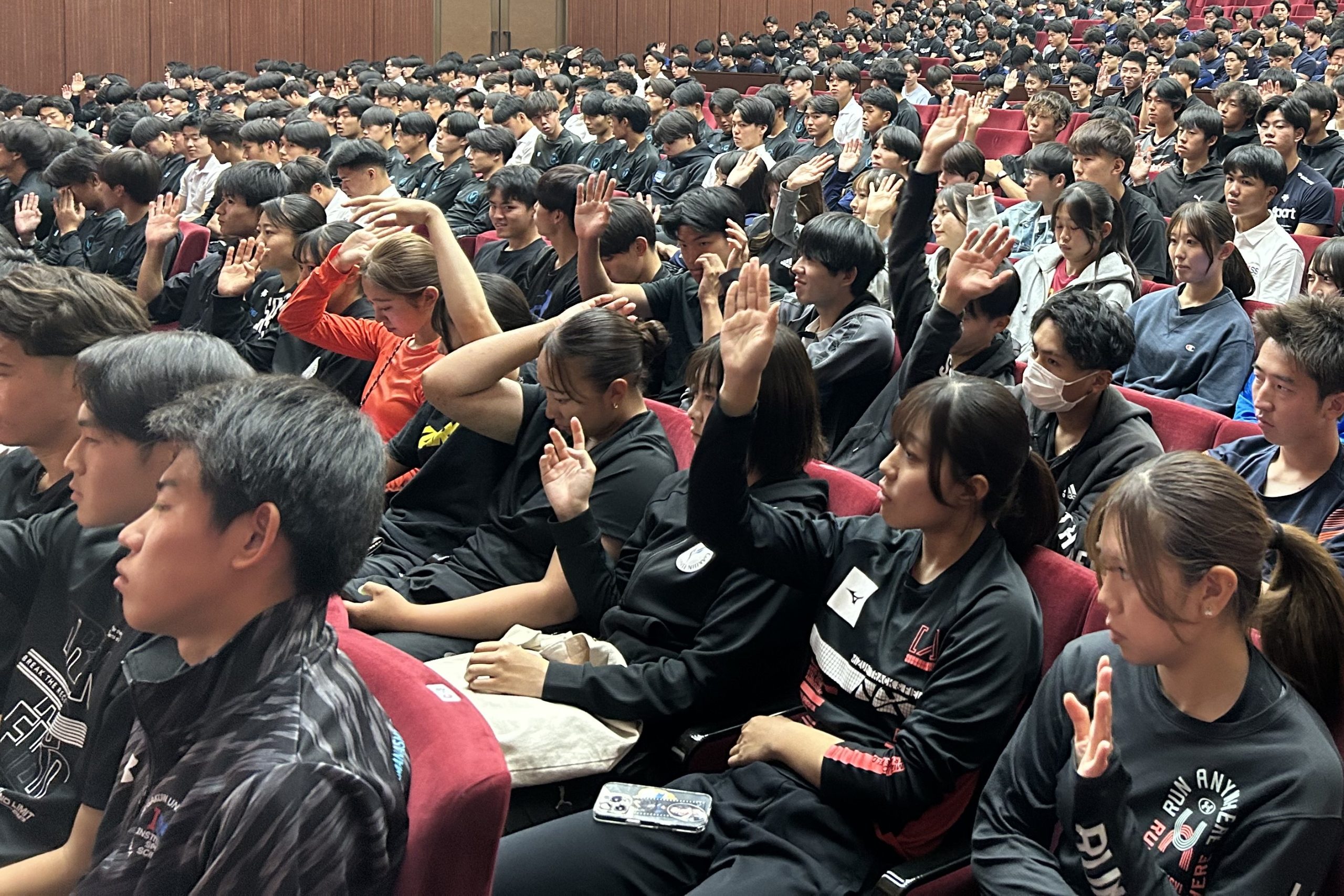 『自転車交通安全講習』を開催しました(5月28日(水)メモリアルホール。対象:甲府市川田エリアに練習拠点のある本学強化育成クラブの学生及び代表指導者。448名が参加)。