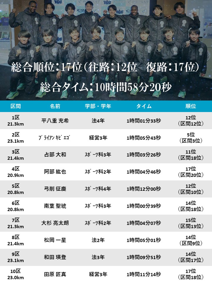 結果は往路12位、復路17位、総合17位と目標であったシード権獲得には届きませんでしたが、