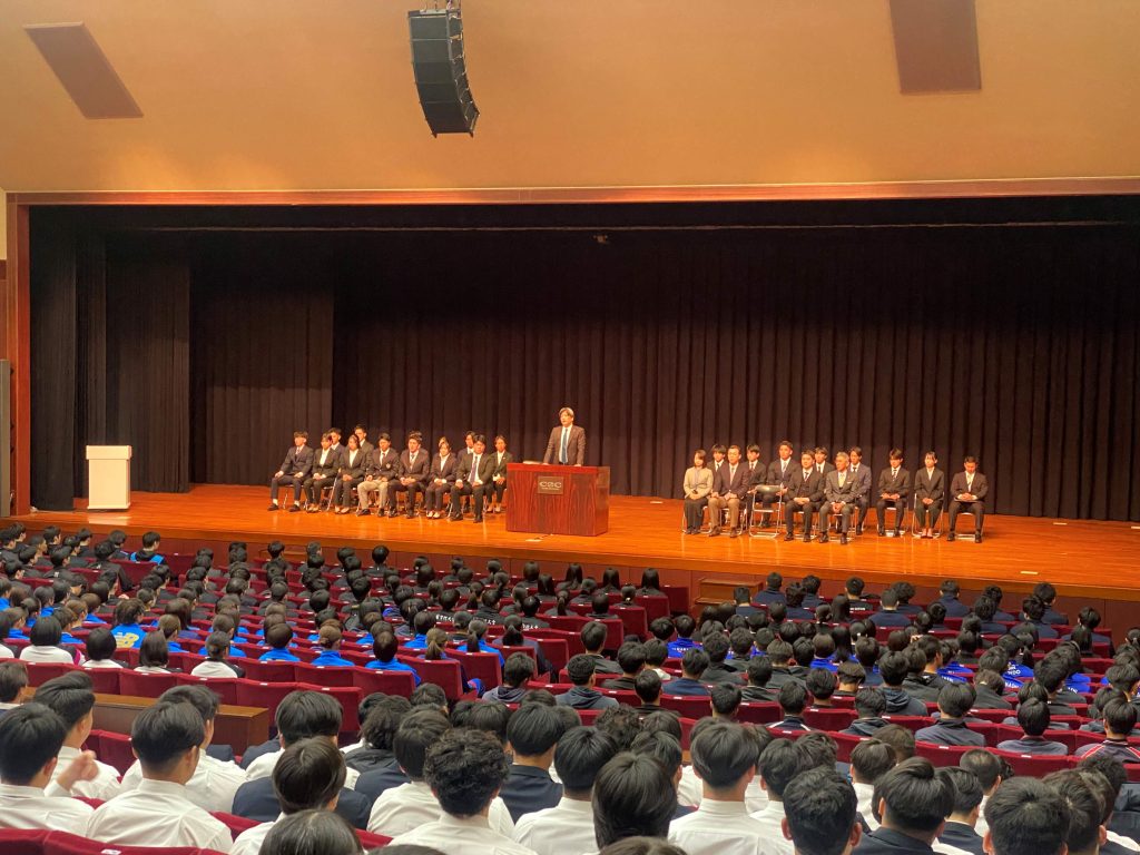 みなさん、こんにちは。本日は、山梨学院大学強化育成クラブ総会を開催し、各クラブの皆さんと一緒に一年間の歩みを振り返る機会を持てることを大変うれしく思います。日々の厳しい練習に励みながら、学業とも両立し、競技に真摯に向き合ってきた皆さんの努力に、まず心から敬意を表したいと思います。