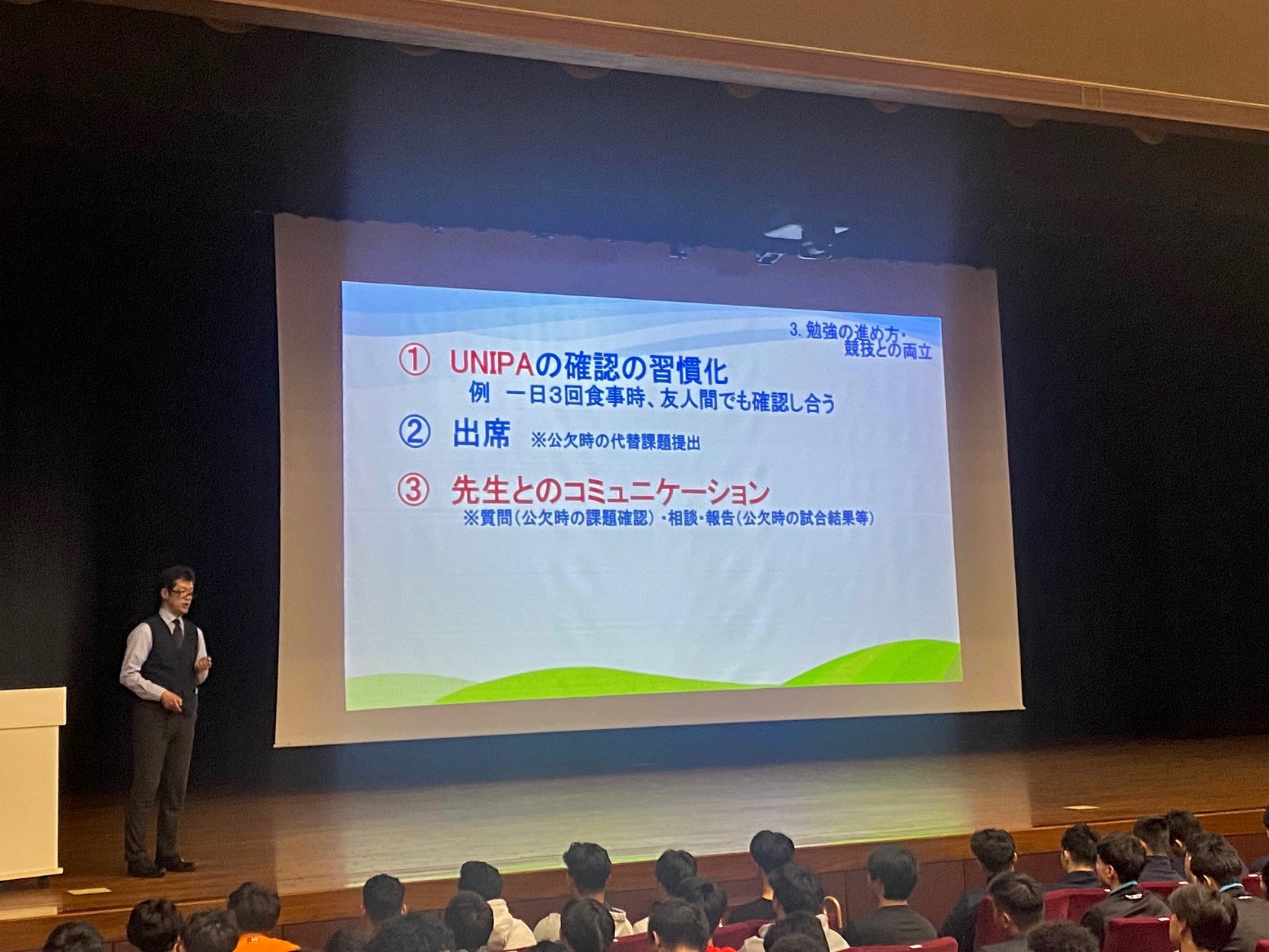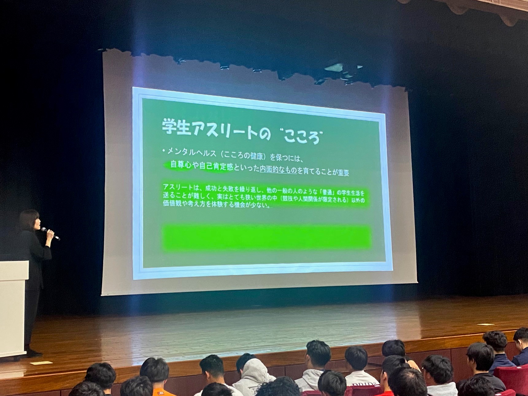 3人の講師(本学の教職員)から、本プログラムの趣旨・目的、アスリート学生にとって重要なテーマである「競技と学業の両立の仕方」、また、「メンタルケアの大切さやその方法」が伝えられました。